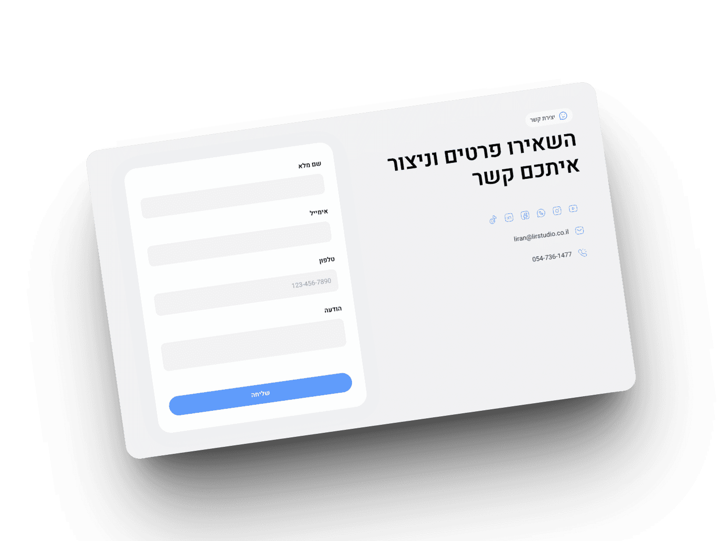 טופס קצר וברור שמזמין את הלקוח להשאיר פרטים ואתם מקבלים את הליד ישירות למייל – מסודר, נוח, ומוכן לטיפול מיידי.